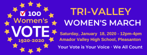 The Tri-Valley Women’s March is sponsored by Students for Social Change, partnered with Tri-Valley Women’s Action Group, Livermore Indivisible, and OFA East Bay Central.